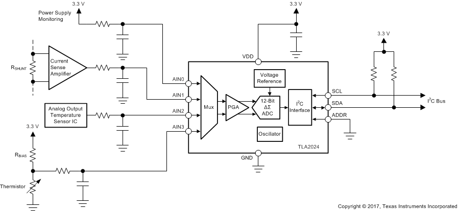 TLA2021, TLA2022, and TLA2024 器件 (TLA202x) 均为易于使用的低功耗、12 位 Δ-Σ 模数转换器 (ADC),适用于任何类型的系统监控 应用 (比如电源或电池电压监控、电流检测或温度测量)。TLA2021 和 TLA2022 采用超小型无引线 10 引脚 X2QFN 封装,为单通道 ADC,而 TLA2024 采用 灵活的输入多路复用器 (MUX),具有两个差动输入测量选项或四个单端输入测量选项。TLA202x 集成了电压基准和振荡器。此外,TLA2022 and TLA2024 包括一个可编程增益放大器 (PGA),其可选输入范围为 ±256mV 至 ±6.144V,可同时支持大小信号测量。TLA202x 通过兼容 I2C 的接口进行通信,且既可在连续转换模式下工作,也可在单冲转换模式下工作。在单冲转换模式下,这些器件会在一次转换后自动断电,从而显著降低空闲期间的功耗。所有这些 特性,加上较宽的工作电源电压范围,使得 TLA202x 十分适合功率受限和空间受限的系统监控 应用中,中对于高效率、高电源密度和稳健性的需求。