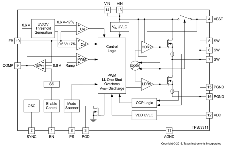 6 V, and output voltage is adjustable from 0.6 V to 0.84 V × VIN.The TPS53311 is available in the 3 mm × 3 mm 16-pin VQFN package (Green RoHs compliant and Pb free) and operates between –40°C and 85°C.