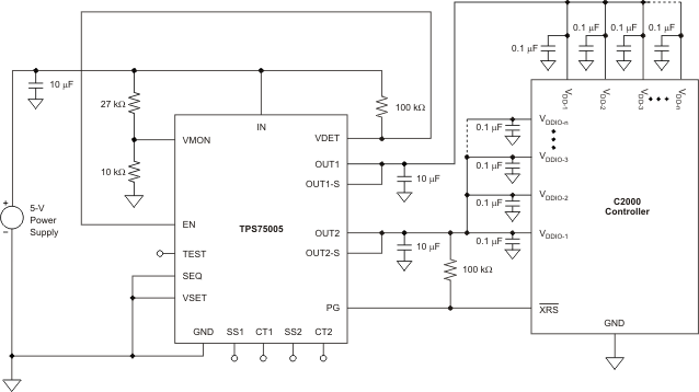 - 用两个 10-µF 陶瓷输出电容器来实现 C2000 MCU 瞬态功能